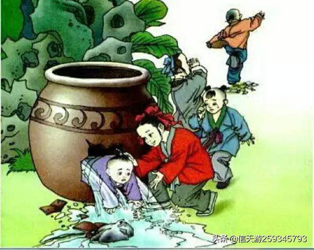 一天,他和几个小伙伴在园子里捉迷藏玩耍,一个小朋友不小心掉到水缸里,小伙伴们惊吓得束手无束,四散跑开。遇事冷静的司马光找来块大石头,双手举起奋力砸破了水缸,水流出来了,那位小伙伴得救了。